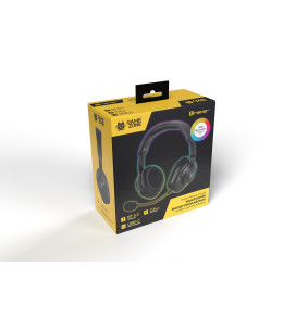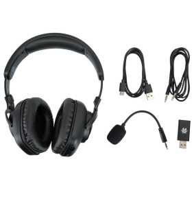 Belaidės žaidimų ausinės su nuimamu mikrofonu ir apšvietimo funkcija. Jos turi USB jungtį ir du 3,5 mm lizdus, leidžiančius įvairų naudojimą.