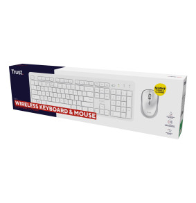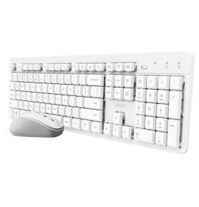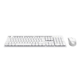 Balto spalvos bevielis klaviatūros ir pelės rinkinys su atsparumu išsiliejimui ir reguliuojamu klaviatūros aukščiu. Suderinamas su Windows, Mac OS ir ChromeOS, turi pilno dydžio išdėstymą ir 1600 DPI optinę pelę.