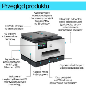 HP OfficeJet Pro 9130b yra belaidis visų viename spalvotas spausdintuvas, palaikantis dvipusį spausdinimą, kopijavimą ir skenavimą. Jis turi maksimalų mėnesinį darbo ciklą iki 30 000 puslapių, spausdinimo greitį iki 25 puslapių per minutę juodai ir 19 puslapių per minutę spalvotai, taip pat automatinį dokumentų tiektuvą, talpinantį iki 35 lapų.
